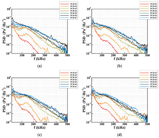 PSD results for the K sensor ray, Re∞ = 6.09 × 106 m−1: (a) Rn = 0.06 mm; (b) Rn = 0.56 mm; (c) Rn = 1.125 mm; (d) Rn = 2.34 mm.