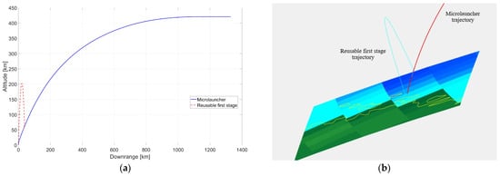 The primary mission of the reusable microlauncher is to deliver the payload (satellite) to a specified target orbit. The characteristics of the mission profile depend on the payload mass and the specified target orbit altitude. Because the primary categories of satellites that are inserted with the aid of microlaunchers are those of mini and microsatellites (10–100 kg) [36], they are usually reserved for Earth observation missions. The corresponding target orbits of interest are of low-altitude (ranging from 200 to 800 km, predominantly near the 400 km region) and high-inclination (polar or Sun-synchronous). Thus, the ascent trajectory of the microlauncher is often a direct ascent to orbit type (DATO). By using a DATO mission profile, the complexity of the rocket engines is lower (compared to a two-burn trajectory), as no successive restarts are needed for the upper stage (second stage in our case). Another advantage with respect to using a DATO trajectory is that of lower mission time, with the payload being anticipated to reach the target low Earth orbit in under 10 min from lift-off (in paper [30], the influence of LEO target altitude on the DATO mission time elapsed from lift-off has been analyzed, with the results showing a total mission time of approximately 6 min for a 200 km altitude, polar, circular, and orbit and around 10 min for a 600 km orbit of same specifications).