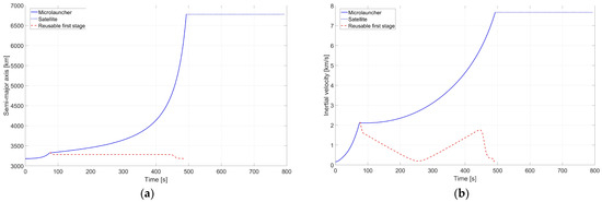The quasi-constant behavior of the payload/satellite evolution after separation from the microlauncher, shown in Figure 7a–d, confirms the successful accomplishment of the main mission. Related to the satellite evolution, one can see in Figure 8b the full coverage that a polar LEO can have, justifying its popularity among Earth observation satellites. Additionally, the Mercator projection shown in Figure 8a also presents the evolution of the microlauncher and first stage during its missions.