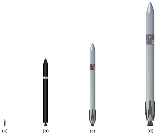 Microlauncher concepts CAD comparison: (a) human for scale (1.8 m height); (b) expendable concept [16]; (c) downrange recovery concept [15]; (d) RTLS recovery concept (current paper).