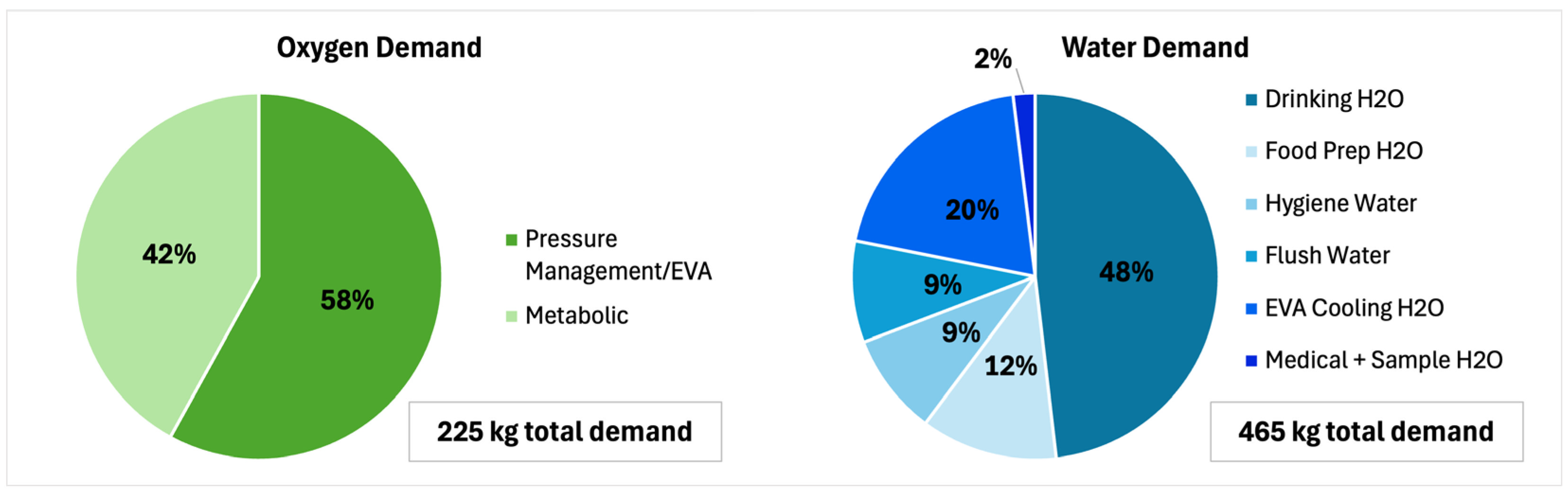 An analysis for a representative 28-day Artemis mission with a total of four crew members using both the PR and MPH estimates a raw consumable need of approximately 225 kg of oxygen and 465 kg of water, where an average O