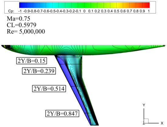 Table 2 provides a summary of the primary geometrical parameters defining the DLR-F6 configuration. The corresponding geometry, including pressure coefficient contours and cross-sectional slices for the wing and fuselage, is presented in Figure 2. Furthermore, Figure 3 illustrates the surface discretization and the overall mesh topology employed for the wing-body model. For the wing pressure distribution analysis, benchmark data from ONERA S2MA wind tunnel experiments [22] are used for validation. These tests were conducted at a freestream Mach number of 0.75, a Reynolds number of 5 million, and a target lift coefficient of 0.5979. In the subsequent Figure 4, the experimental measurements are denoted by black points, while the computational fluid dynamics (CFD) results from the present simulation are represented by a solid red line.