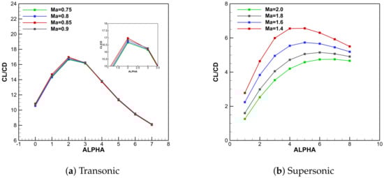 3.4. Aerodynamic Performance in Different Mach Numbers for Transonic and Supersonic Conditions