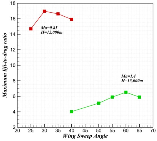As shown in Figure 10, the wing rotates about a pivot axis located at 50% of the root chord length. As the oblique angle increases, the effective aspect ratio decreases proportionally to of the oblique angle. In conventional swept wings, increasing the sweep angle reduces the lift–curve slope. In oblique-wing aircraft, increasing the oblique angle simultaneously increases the effective sweep of both the forward-swept and after-swept panels. Unlike fixed swept wings, the three-dimensional flow field of an oblique wing further increases the spanwise velocity component. At the design condition-cruise condition, the oblique-wing aircraft operates at an angle of attack (AoA) of 1–3°. For consistency in comparison, all oblique-wing analyses use an angle of attack of 2°. The reference conventional configuration has a fixed sweep angle in the subsonic range of 25–40°. Transonic computations are performed for oblique angles of 25°, 30°, 35°, and 40°. As shown in Figure 11, Figure 12 and Figure 13, the maximum lift-to-drag ratio at transonic speeds occurs at an oblique angle of 30°. In the supersonic regime (oblique angles 40–65°), this maximum value increases monotonically with an increasing oblique angle.