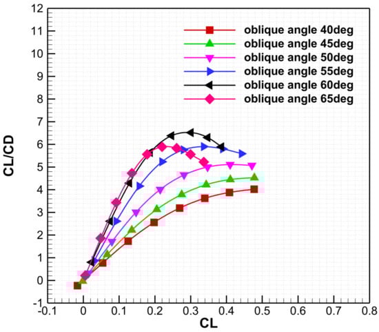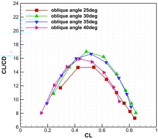 Lift-to-drag ratio curve in different oblique angles at transonic condition.