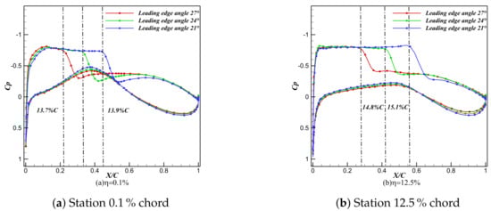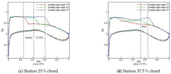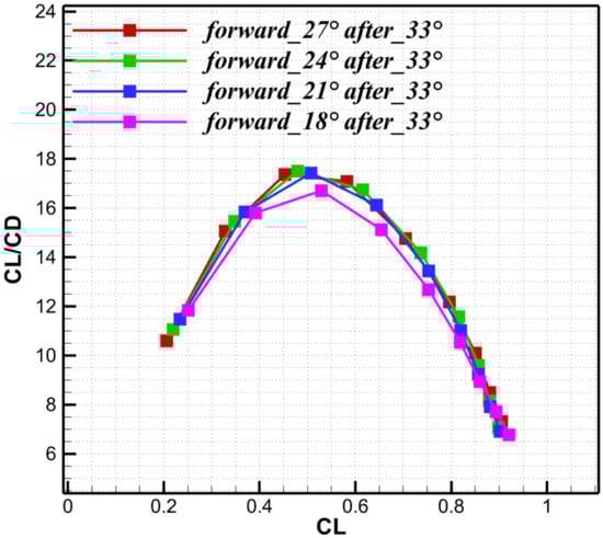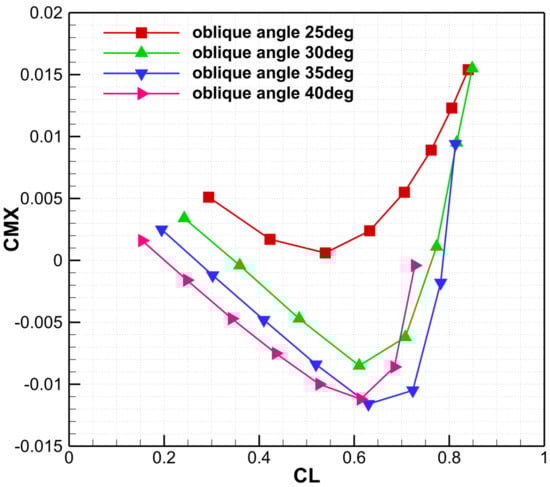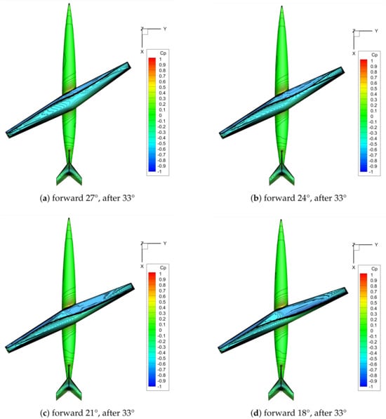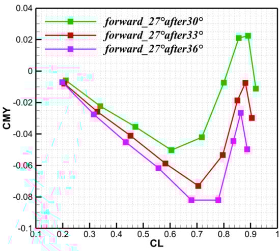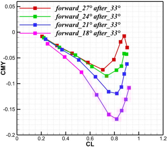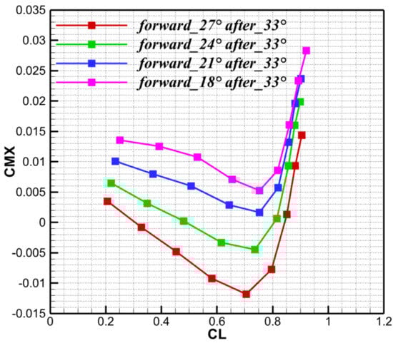 As shown in Figure 20, under the cruise condition with a lift coefficient of , the rolling-moment curve exhibits a minimum when the forward wing has a leading-edge sweep of 24° and the after wing 33°. The specific values of the rolling moment under this condition are shown in the following Table 4. Further reduction in the forward-wing leading-edge sweep translates the curve upward.