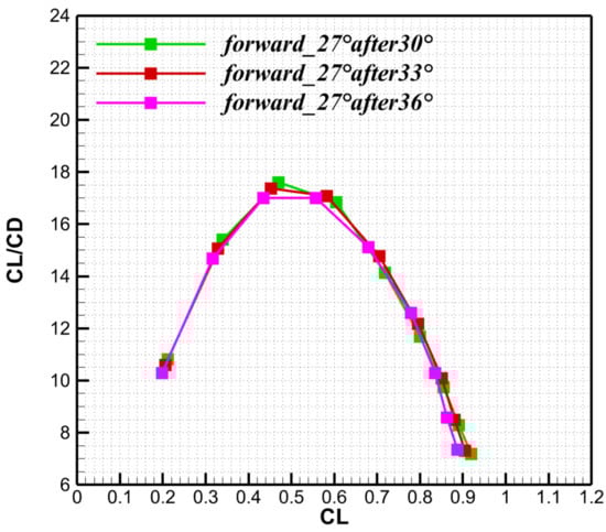 Lift-to-drag ratio for different after-wing leading-edge angle.