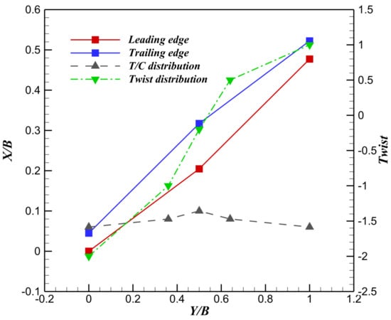 Based on the previous section, the design is carried out on the basis of the conceptual design, aiming at transonic and supersonic flight, and minimizing the asymmetric effect as much as possible. To reduce the downwash effect of the forward wing on the after wing, an asymmetric twist angle distribution from −2° to 1° is equipped from the wingtip of the forward wing to the wingtip of the after wing. Regarding the aspect ratio selection, studies show that the aspect ratio of most oblique-wing aircraft is between 9.5 and 13 [18], and here the middle value of 11 is chosen. In terms of airfoil selection, the F-8 adopted the NASA-SC(2) family series airfoil NASA-SC(2)0714 [19]. Considering the requirements of drag reduction at transonic and supersonic speeds, here the NASA-SC(2)0712, NASA-SC(2)0710, and NASA-SC(2)0708 series airfoils are selected. The above series of airfoils only have a change in relative thickness. The changes in twist angle and relative thickness are shown in Table 1. In terms of the root-to-tip ratio selection, the root-to-tip ratio of the forward and after wings is set to 0.4. During the conceptual design phase, the rotating shaft structure is overlooked, and the gap between the wing and the fuselage is 0.2 m.