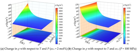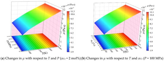 Based on the calculated equilibrium composition, the viscosity coefficient μ was calculated according to Equation (12), and the values of μ are plotted with respect to temperature and pressure (αCs = 2 mol%) and with respect to temperature and αCs (P = 100 MPa) in Figure 4a,b, respectively.