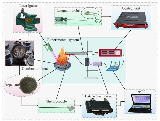 Figure 7 shows the experimental system, which consists of propellant with ionization seeds, a combustion chamber, a laser igniter, a Langmuir probe system control unit, a thermocouple, and other components. The combustion chamber is made of high-temperature-resistant steel. The probe has a tip diameter (dp) of 0.4 mm and a tip length (Lp) of 10 mm, with a distance (ΔLp) of 2 mm between the two tips. The Langmuir probe is connected via wires to the probe system control unit, which provides a voltage sweep range of −150 to 150 V and enables real-time acquisition of probe potential and current data. This allows the current-voltage characteristic curve to be obtained for analyzing plasma parameters. The propellant used is the tri-base propellant, with a precisely measured mass of cesium salt seeds thoroughly mixed into the propellant using a high precision balance. This setup allows testing of plasma parameters in the combustion flame under three conditions with ionization seed mass fractions of 1%, 2%, and 4%.