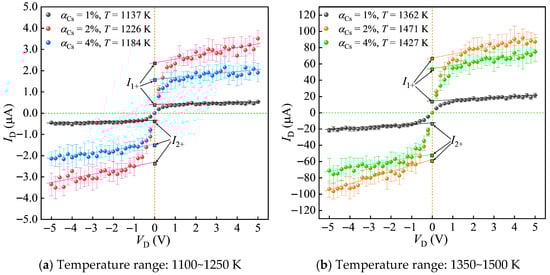Before testing, the scanning voltage of the Langmuir double probe was set to −5~5 V (with a voltage step of 0.2 V), the loading time of the scanning voltage was 20 ms, and after each scan, a 20 ms interval was applied for continuous scanning and calibration. Repeatability verification conducted before testing served to limit random error effects on the experimental data. After laser ignition, testing began once the propellant flame had stabilized. For each test point, voltage-current values were recorded 10 times, and the average was taken as the final current-voltage characteristic curve. Additionally, outliers that deviated significantly from the average in the experimental data were excluded to avoid the influence of errors. Based on this, plasma parameters at different temperatures were studied by varying the mass fraction of cesium nitrate in the propellant and adjusting the probe position within the flame. Multiple laser ignition experiments were conducted with simultaneous recording of current-voltage characteristic curves, thereby obtaining multiple sets of plasma parameter values under different ionization seed contents and temperatures. The results are shown in Figure 9.