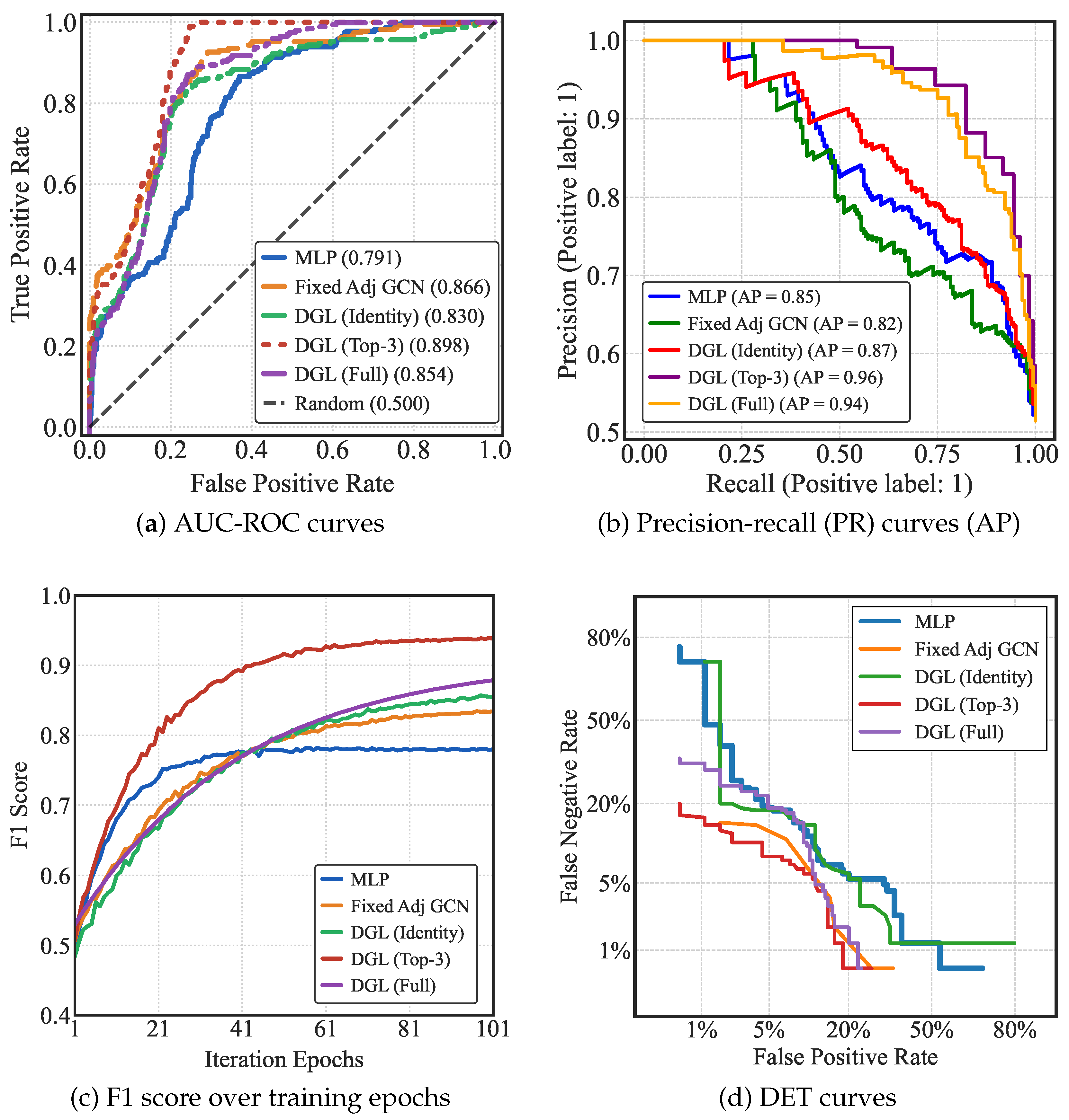 Figure 4 (encompassing F1 Score, AUC-ROC, PR, and DET metrics) demonstrate substantial performance disparities among the five models MLP, Fixed Adj GCN, DGL (Identity), DGL (Top-3), and DGL (Full) across all evaluation dimensions, with graph-based models consistently outperforming the baseline MLP model. Notably, the dynamic Top-3 graph convolution model DGL (Top-3) achieves the most prominent performance across all metrics, supported by robust quantitative and qualitative evidence.