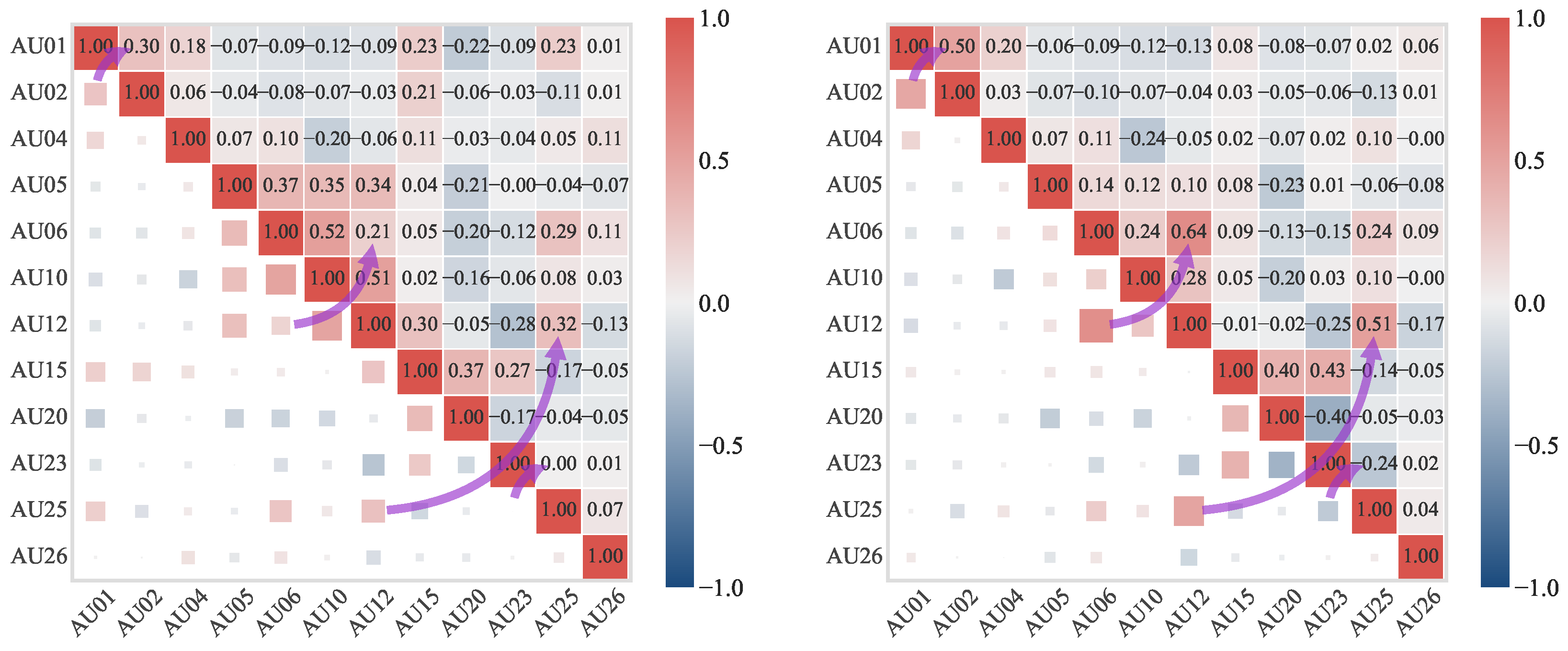 Through comparative analysis of AU relationship heatmaps, we examined the differences between fixed AU adjacency matrices and those generated by dynamic AU graph convolutional methods upon model convergence. The heatmaps visually represent the association strength between AU pairs through color coding (red for positive correlation/synergistic effects, blue for negative correlation/antagonistic effects) and grid size.
