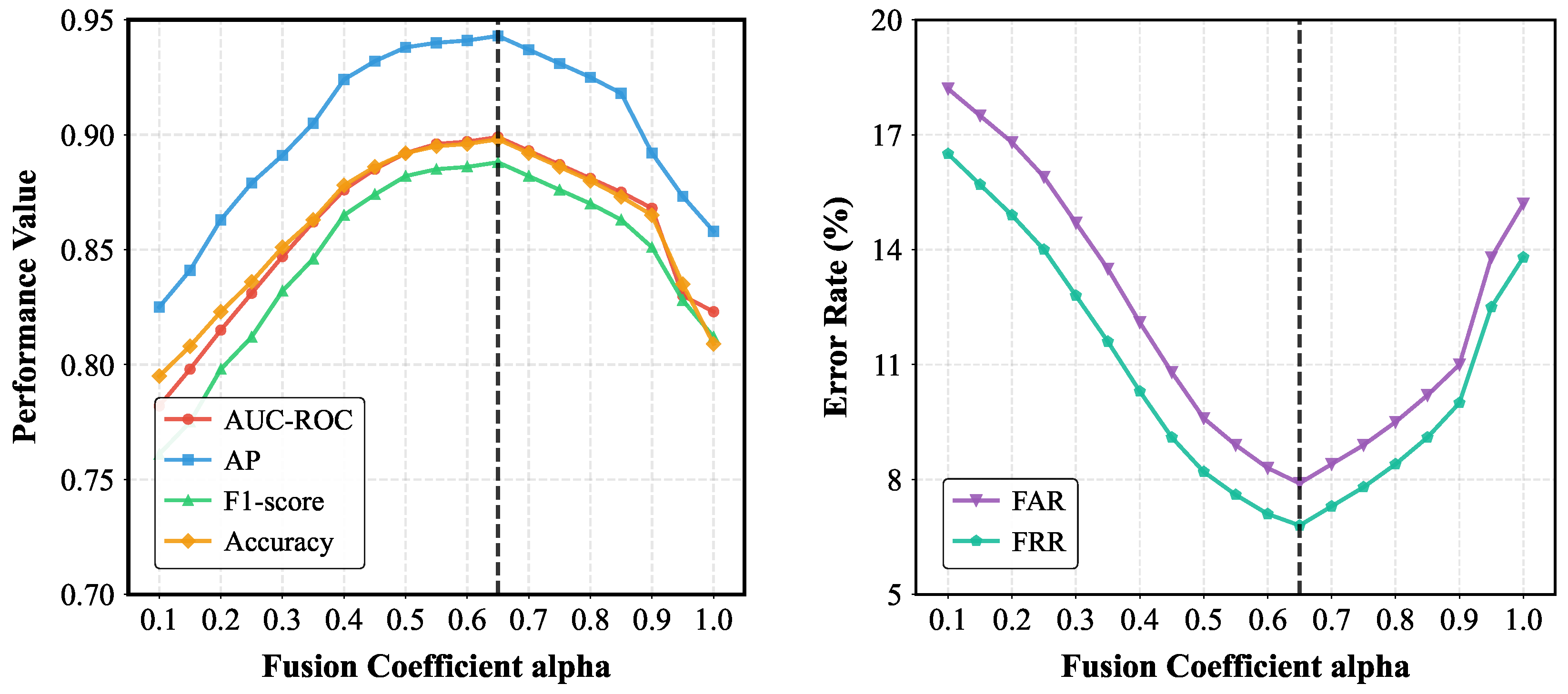 varies from 0.1 to 1.0 with a step size of 0.05, the model’s classification performance metrics (AUC-ROC, AP, F1-score, Accuracy) and early warning reliability metrics (FAR, FRR) exhibit a consistent “rise-first-then-fall” nonlinear trend, fully revealing regulatory role in model performance. When