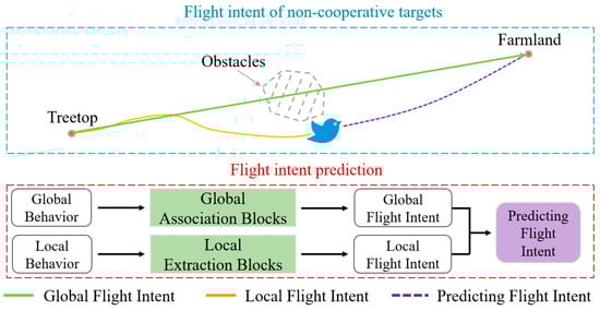 The complexity of intent prediction arises because global intent and local intent, though interrelated and markedly distinct, require distinct analytical approaches. As shown in Figure 1, flight intent comprises a global intent (green line, denoting the bird’s overall objective of moving from the treetop to the farmland) and a local intent (yellow line, representing the localized adjustments driven by obstacles or wind). When predicting intent, two main categories of methods are typically distinguished: first, traditional algorithm-based approaches [21,22,23,24,25,26], which rely on kinematic models, and second, deep learning-based approaches [27,28,29], which employ machine learning algorithms. However, existing approaches typically focus on only global or local levels; while this suffices for targets whose intent changes little, it struggles to deliver accurate predictions for non-cooperative targets whose intent varies frequently.