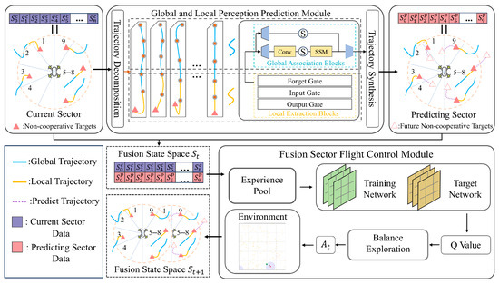 In summary, existing collision avoidance algorithms are limited by their specialized application scenarios and fail to account for environments with numerous non-cooperative targets exhibiting diverse flight intents. These methods lack the capability to integrate non-cooperative target intentions into collision avoidance strategies. To address this, this work constructs a Fusion Sector Flight Control Module based on a deep reinforcement learning model. By incorporating an improved state space design, the module enables the integration of current and predicted future states, thereby enhancing the system’s ability to avoid collisions with non-cooperative targets of varying flight intents.