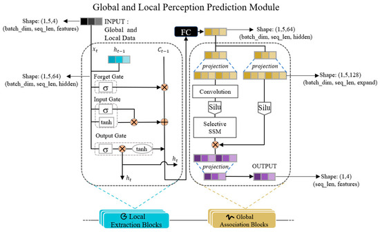 The proposed GLPPM first processes temporal sequences through LEB, where LSTM units extract localized temporal features via gating mechanisms (including forget, input, and output gates) to capture dynamic dependencies between adjacent time steps. Subsequently, a fully connected layer performs linear transformation on the feature matrix, reshaping its dimensions to match the input format required by the GAB. The reshaped matrix is then fed into the GAB, where the MAMBA network leverages its SSM with linear-complexity architecture to efficiently model long-range dependencies. This integration preserves LSTM’s sensitivity to short-term dynamics while enhancing the model’s ability to perceive long-distance temporal associations through MAMBA’s global modeling capabilities. The above process can be mathematically described as follows: