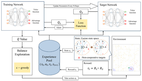 Schematic diagram of Fusion Sector Flight Control Module based on the D3QN algorithm. Built upon the fusion state space, the model acquires the ability to integrate both the current risk-profile sectors and the future high-risk sectors, endowing it with a stronger perception and assessment of future collision risk. Complemented by a specially designed reward function, it guides the UAV to autonomously navigate toward the target waypoint while automatically avoiding non-cooperative targets encountered along the trajectory.