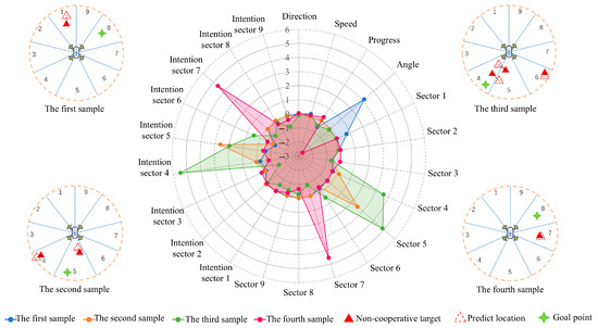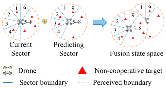 The information in consists of the normalized relative distances between the UAV and the nearest non-cooperative targets within each sector at time . For the nth sector, this distance is denoted by ; if there are no non-cooperative targets in a sector, its value is 1. The information in consists of the predicted normalized relative distances between the UAV and the nearest non-cooperative targets within each sector at time . For the nth sector, this predicted distance is denoted by . Thus, and can be represented as: