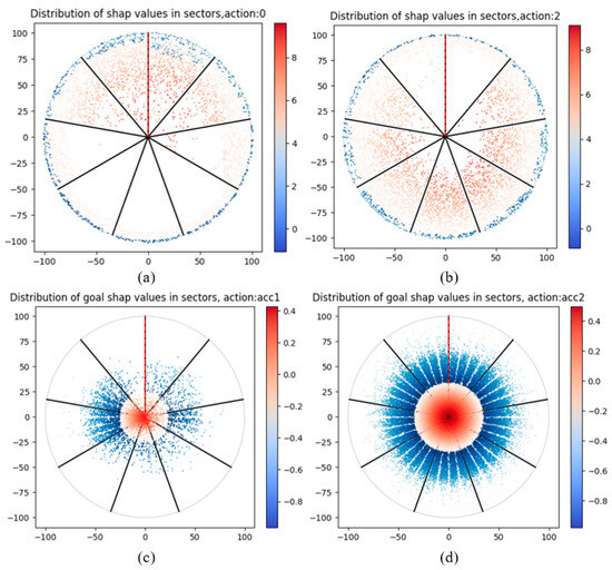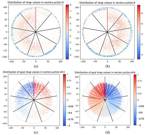 Regarding Figure 11c, it depicts how the spatial distribution of goal points influences the drone’s straight-ahead action; the goal point located in Sector 9 (directly ahead on the right) has the strongest influence on this decision, with the impact intensity increasing as the distance decreases. This indicates that targets in this direction encourage straight movement. As the clockwise angle between the goal point and the agent’s heading increases, the influence weakens. When the goal point is positioned behind the agent, the encouraging effect vanishes. Further, as the angle increases, targets on the agent’s left side begin to suppress straight movement. The strongest suppression occurs when the goal point is in Sector 1 (directly ahead on the left), with the suppression effect intensifying as the distance decreases. Regarding Figure 11d, it shows how the spatial distribution of goal points influences the drone’s left-turn maneuver; the goal point located in Sector 1 (directly ahead on the left) has the greatest impact on this decision, with influence intensity increasing as the distance decreases. This indicates that targets in this direction encourage a left-turn maneuver. As the counterclockwise angle between the goal point and the agent’s heading increases, the influence weakens. When the goal point is positioned behind the agent, the encouraging effect disappears. Further, as the angle increases, targets on the agent’s right side begin to suppress left-turn actions. The strongest suppression occurs when the goal point is in Sector 9 (directly ahead on the right), with the suppression effect intensifying as the distance decreases.