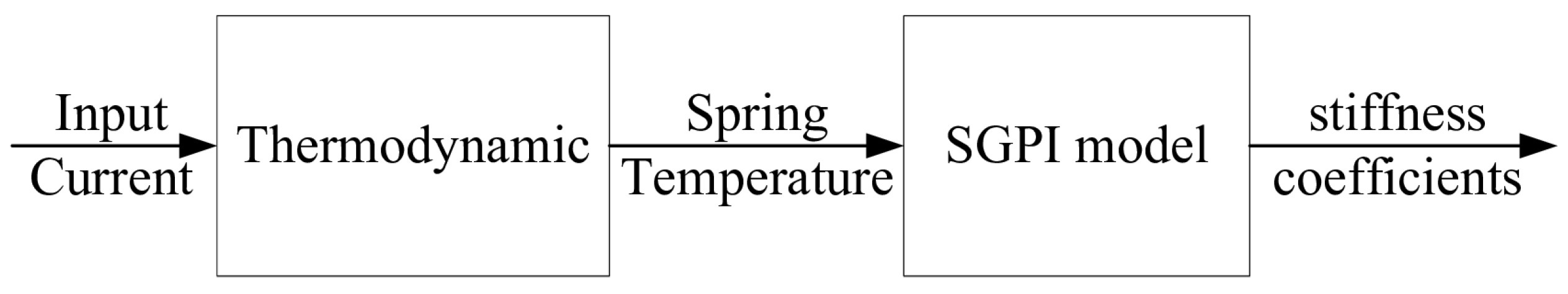 Figure 2, the mathematical model of the SMA actuator system consists of two components: a thermal model and an SGPI phenomenological mathematical model. The thermal model characterizes the relationship between the input current and the spring temperature, while the SGPI model describes the relationship between the spring temperature and the stiffness coefficient of the SMA actuator.