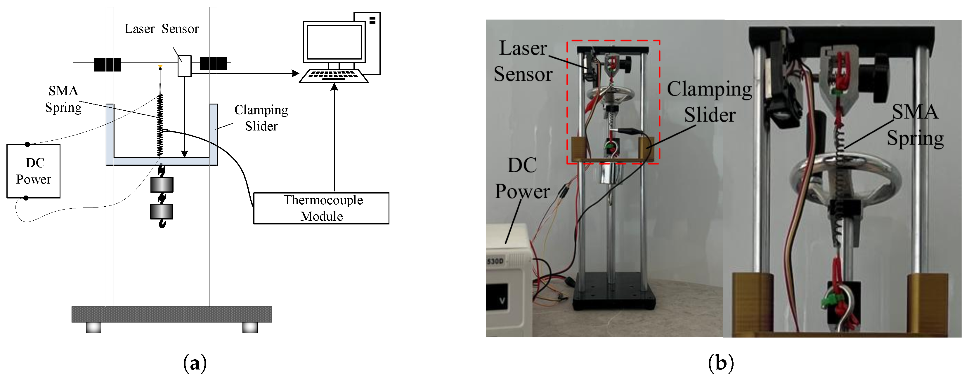 Figure 5b showing the experimental setup of the SMA actuator. The system comprises six components: a SMA spring actuator, clamping slider, programmable power supply, computer, laser displacement sensor, and a thermocouple temperature module. One end of the SMA spring was clamped, whereas the opposite end was connected to the slider via a hook weight. The slider was moved vertically along the linear guide. The laser displacement sensor emitted a beam onto the slider surface, continuously measuring the distance between the slider and overhead beam to compute the real-time SMA spring length. A programmable DC power supply applies voltage across both SMA spring terminals. The thermocouple probe was affixed to the SMA spring to measure real-time temperature variations.