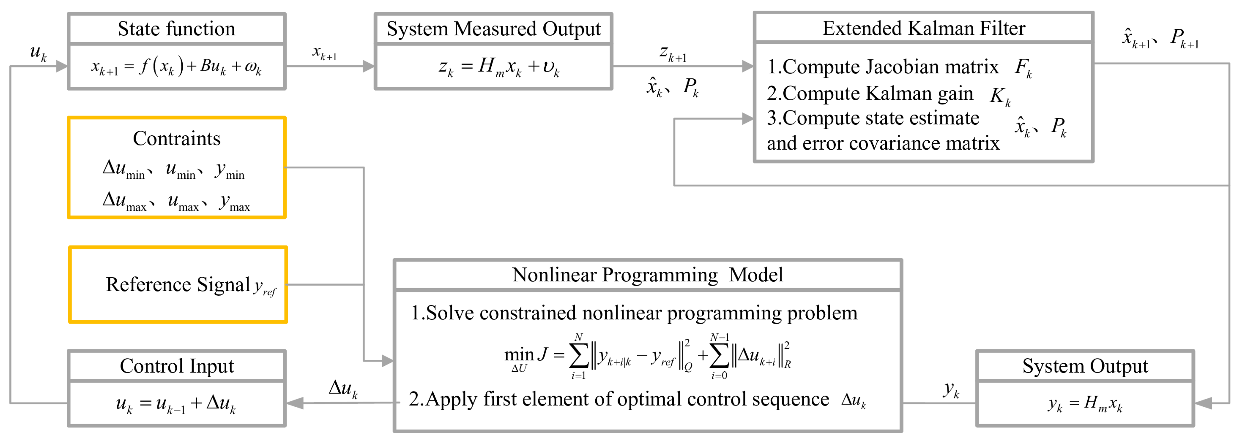 39], a recursive estimation method, is essential for providing accurate state feedback under noisy environments. By combining the predictive characteristics of MPC with the state estimation capabilities of EKF, a closed-loop state-feedback control structure can be established to handle the complex hysteresis nonlinearities of SMA actuators.