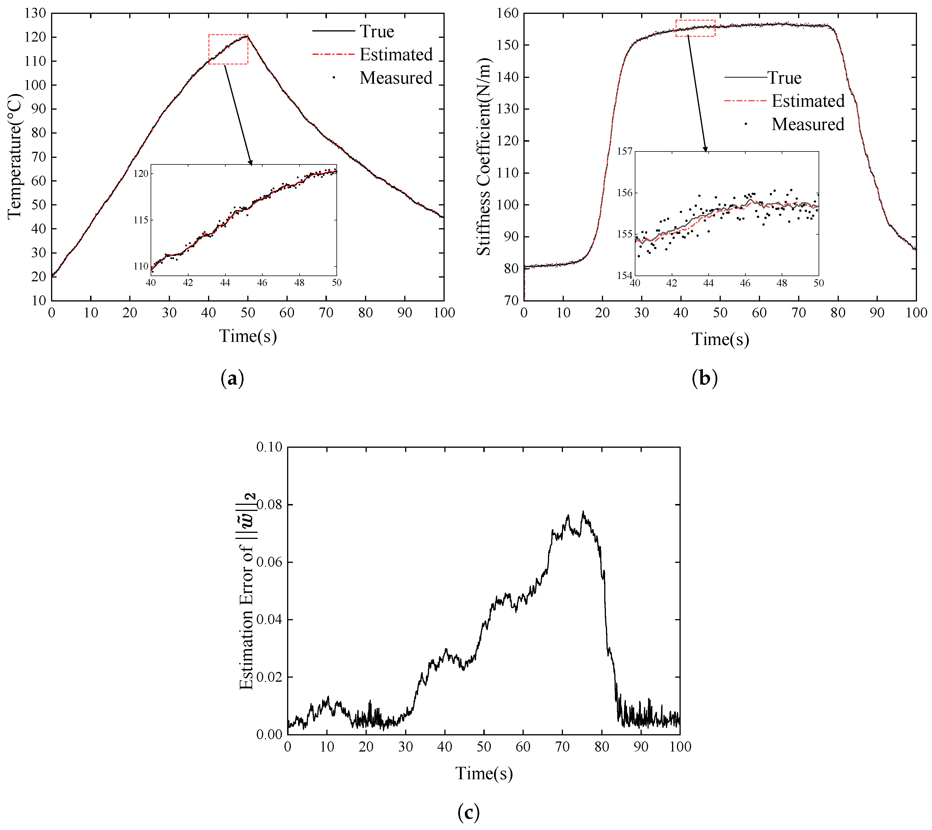 Figure 10b shows the estimated stiffness coefficients trajectory against the measured and true values, and