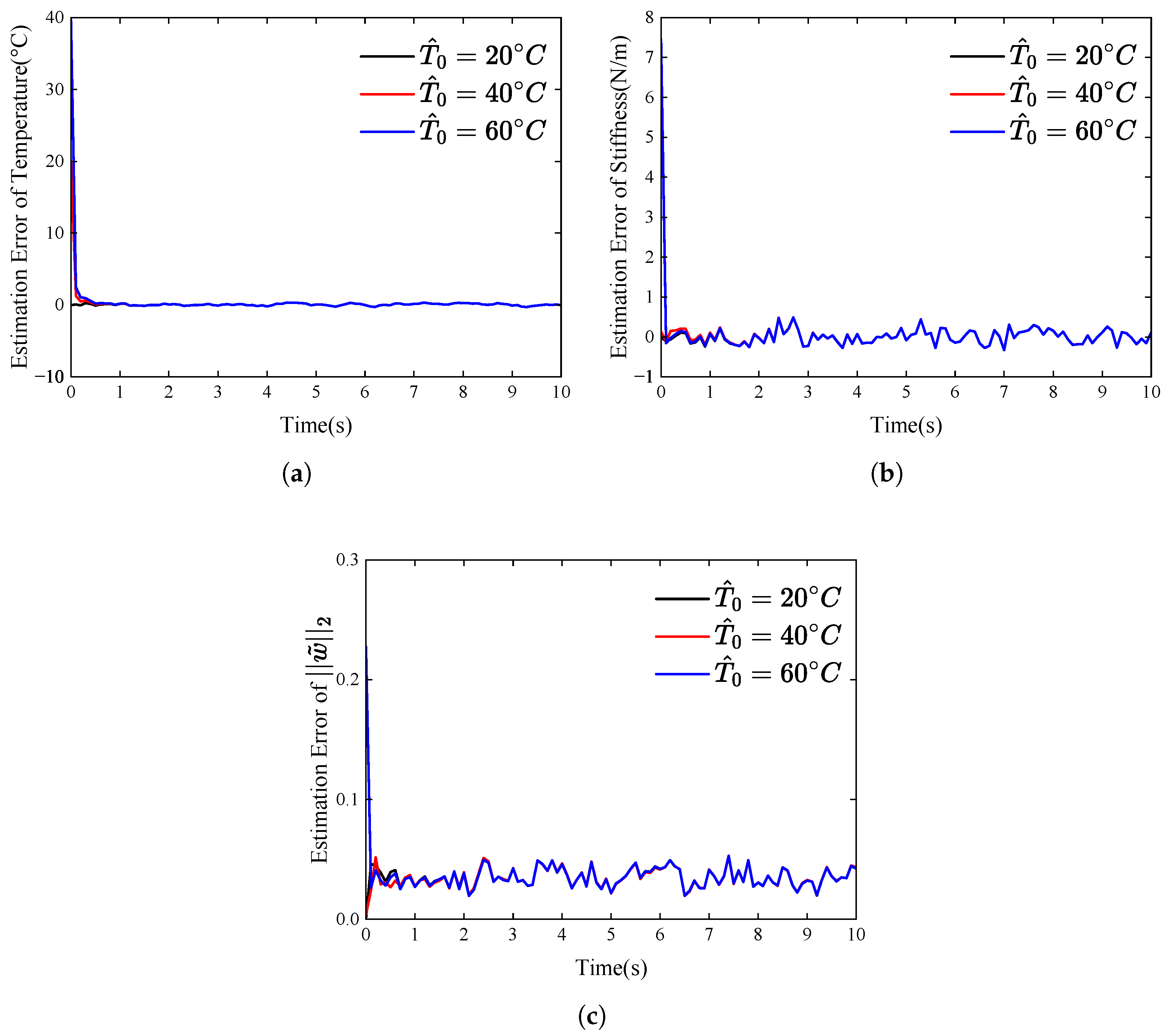 was scaled by factors of 0.1, 1, and 10, respectively. For these three scenarios, the Mean Squared Error (MSE) of the estimation errors for temperature, stiffness, and the Euclidean norm of the virtual hysteresis state vector