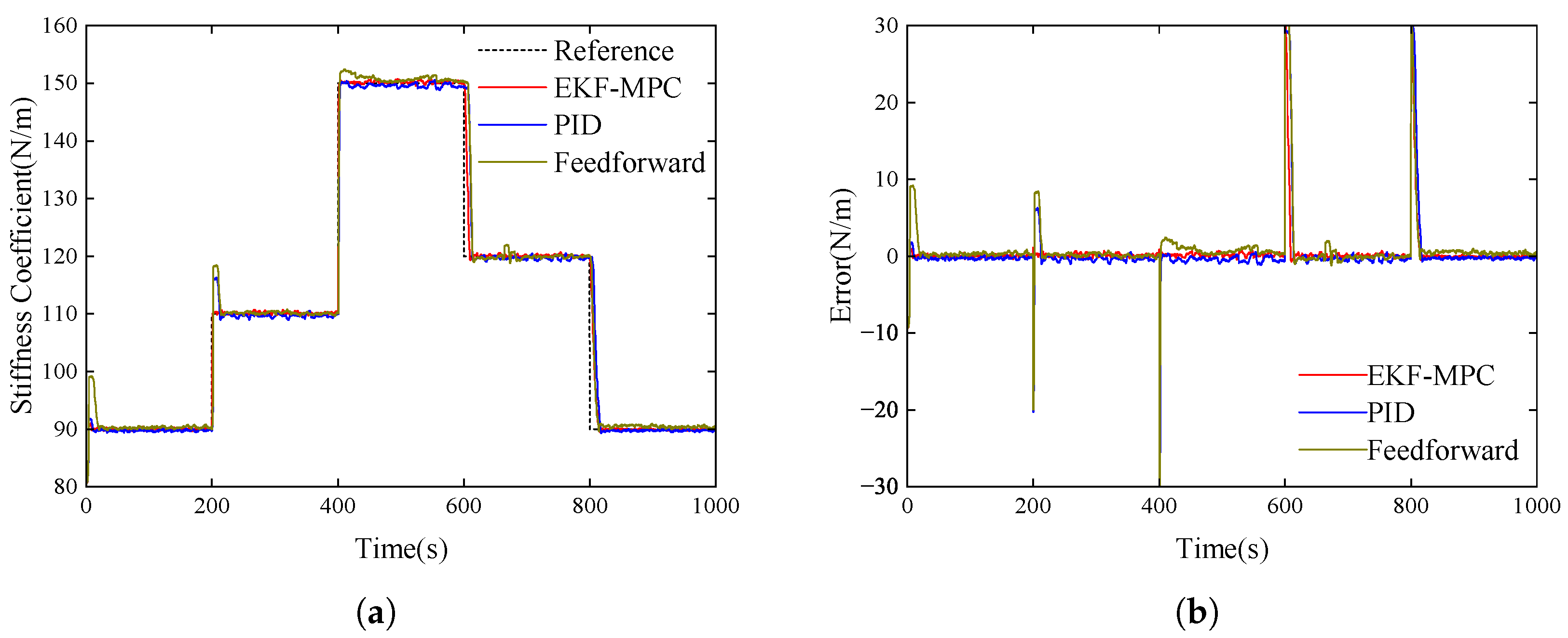 Figure 12 presents the modeled stiffness coefficients tracking and error curves of the three control strategies, and