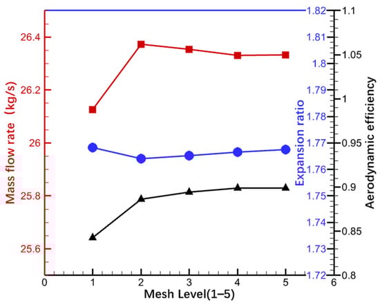 The computational domain of the turbine stage was discretized using structured hexahedral elements, achieving grid independence through the evaluation of five distinct grid configurations. All solutions examined in the grid independence study were single-passage steady solutions at the design operating conditions, as outlined in Table 1. The interfaces between the stator and rotor rows were defined as mixing planes, while periodic boundary conditions were established for both the stator and rotor rows. The computational results across various grid configurations were assessed based on several criteria: static pressure distribution on the blade surface, exit flow angle, expansion ratio, aerodynamic efficiency, and mass flow rate. This paper presents only the results for aerodynamic efficiency and mass flow rate, which are illustrated in Figure 2.