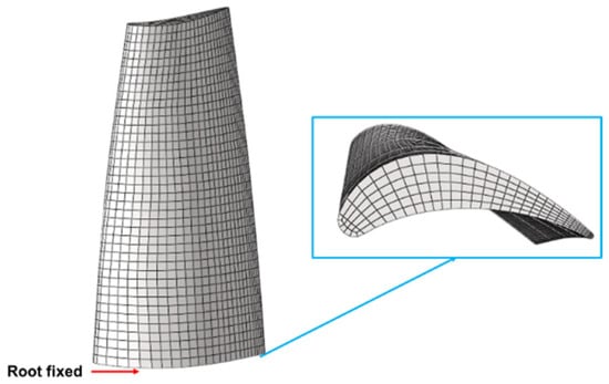 The finite element model of the rotor blade was discretized employing a hexahedral mesh (Figure 3). The selected material for the blade was a high-temperature alloy, characterized by an elastic modulus of 155 GPa, a Poisson’s ratio of 0.31, and a density of 8.44 g/cm3. For the modal analysis, fixed constraints were applied at the blade root to determine the frequencies and modes of the rotor blades at various rotational speeds. The Campbell diagram for the rotor blade is presented in Figure 4, illustrating the first four orders of the natural frequency lines associated with the rotor blade.