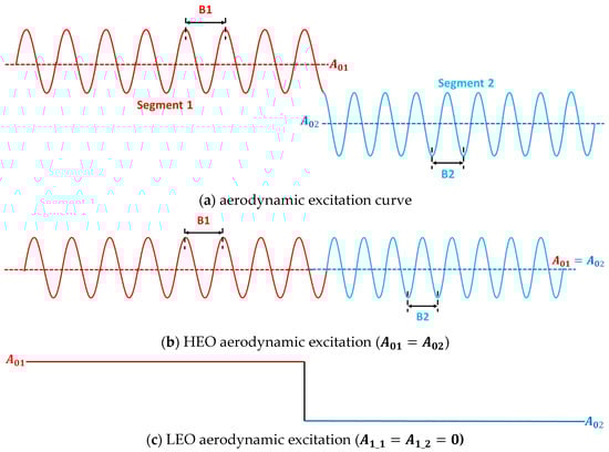 In Figure 7b, the average amplitudes of segments 1 and 2 are equal (), when only the HEO aerodynamic excitation is considered. The aerodynamic excitation curves in Figure 7c contain only the average amplitude of the two segments, and the fluctuation amplitude ( and ) associated with HEO is 0, which can be used to analyze the LEO aerodynamic excitation. In this paper, two sub-models are established to predict the HEO and LEO aerodynamic excitations corresponding to Figure 7b and c, respectively. A detailed description of both sub-models is provided in the following section.