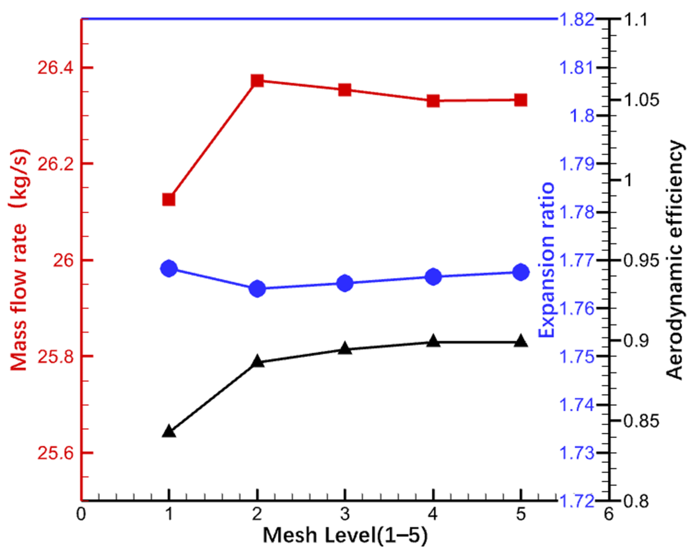 The full-annulus mesh was obtained by rotationally duplicating the single-passage mesh, and the number of full-annulus mesh points for the turbine stage is about 32 million. The aerodynamic disturbances of the stator row are propagated to the rotor row through the sliding plane. The steady converged solution of the full-annular flow field was used as the initial flow field for the unsteady flow calculation. Considering the calculation accuracy and time cost, the time step of unsteady calculation for resonance point A was set to 3.787 , and the time step for resonance point D was set to 2.672 . It takes 32 time steps for the rotor blades to turn through 1 rotor pitch and about 94 steps to turn through 1 stator pitch. When selecting the initial iteration steps, two primary criteria must be considered. The first criterion is that the dominant aerodynamic parameters—such as inlet and outlet mass flow, aerodynamic efficiency, and axial force—should exhibit significant periodic behavior as the time step iterations progress. The second criterion requires that the dominant aerodynamic parameter decrease by at least over the course of 15 sub-iteration steps. Given that the unsteady flow field in the turbine stage typically necessitates post-processing of the computational data for the entire cycle, the total number of iteration steps will be one rotation cycle greater than the initial iteration steps.