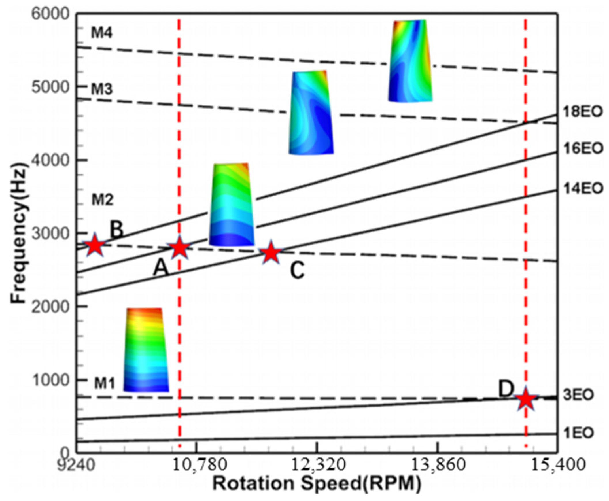 For the single-stage turbine in this paper, the stator count is 16, and the EO range of the aerodynamic excitation concerned is 14–18EO, 1–3EO. The