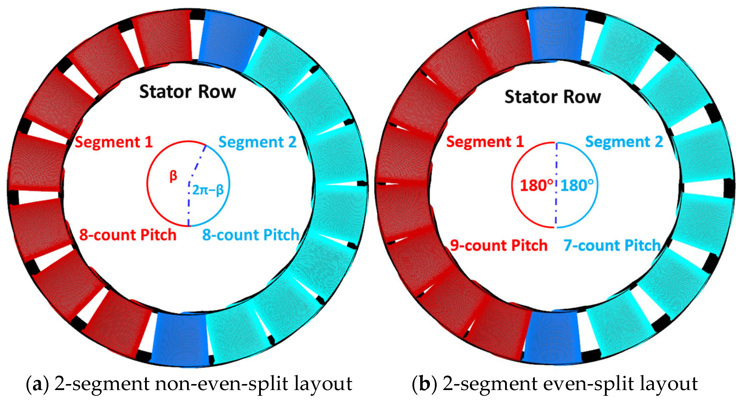 13], that the differences in potential field between two segments are the main source of LEO aerodynamic excitation. A 2-segment non-even-split layout proposed in the previous study can effectively control the difference in the potential field. In this layout, the full-annulus stator can be divided into 2 segments; each segment occupies unequal circumferential angles, but the stator pitch counts within each segment are equal [