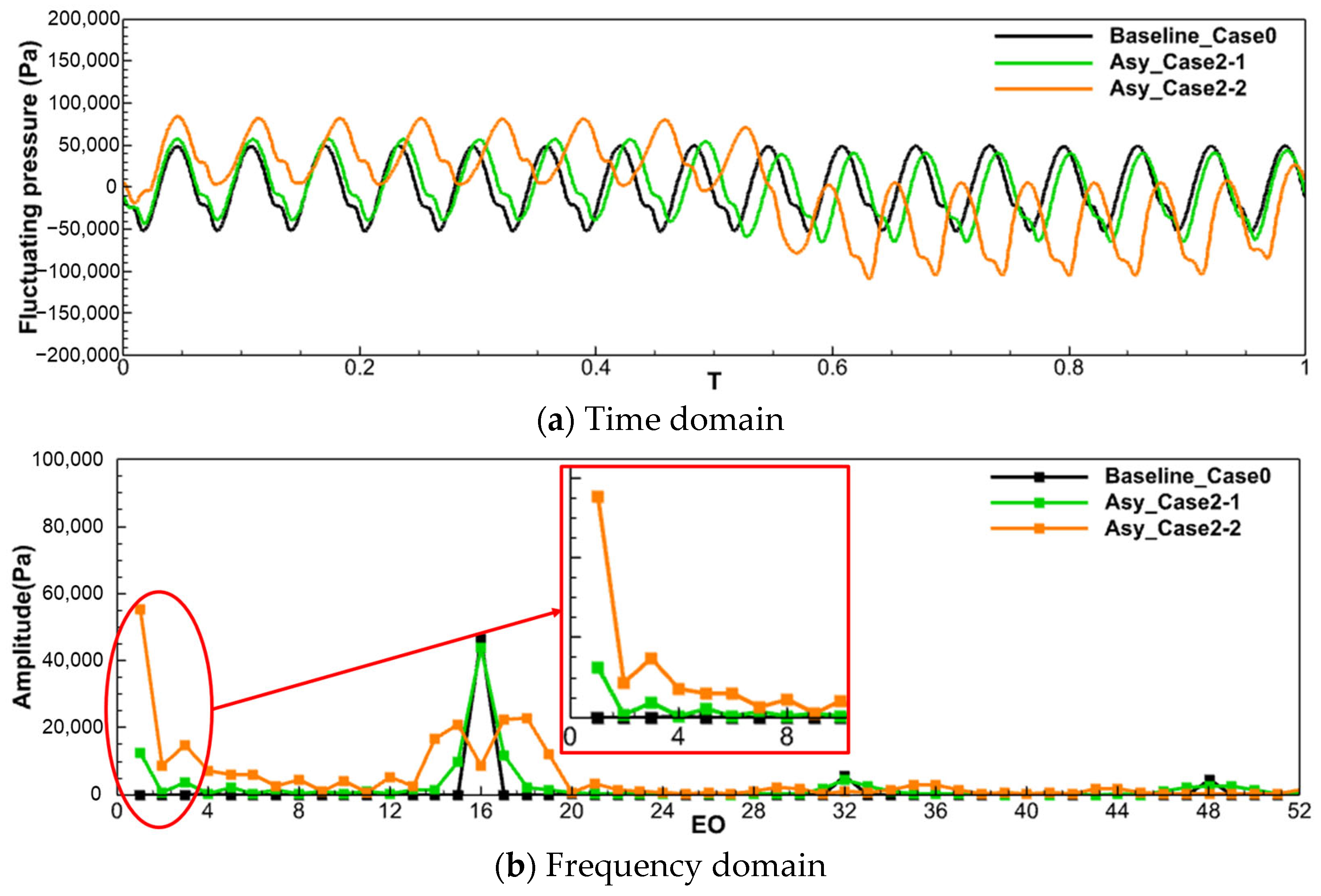 Table 3) on aerodynamic excitations at different engine orders (EOs), the fluctuating pressure—defined as the transient pressure minus the time-averaged pressure for the last rotation cycle (T = 0–1)—is monitored at the leading edge of the rotor blade. The fluctuating pressure values in the time and frequency domains for Baseline_Case0 and the 2-segment non-even-split layout are presented in