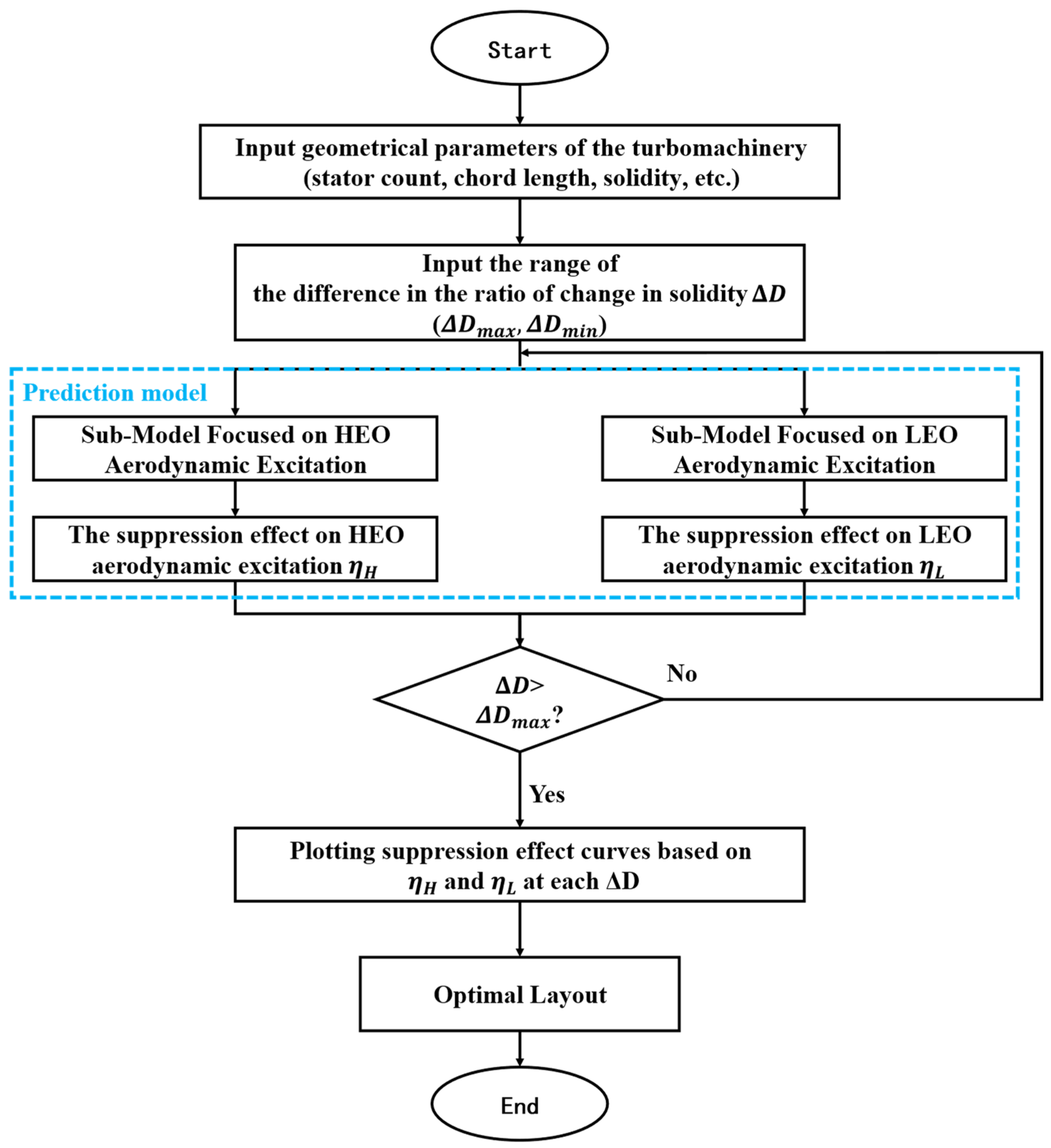 The subscripts 1 and 2 correspond to segments 1 and 2, respectively. It will be demonstrated later that there may be critical values of ΔD due to limitations in solidity change and maximum vibration amplitude. To effectively measure the suppression effect of HEO and LEO aerodynamic excitations across different layouts, the suppression effect parameter η is defined. When the subscript is H,