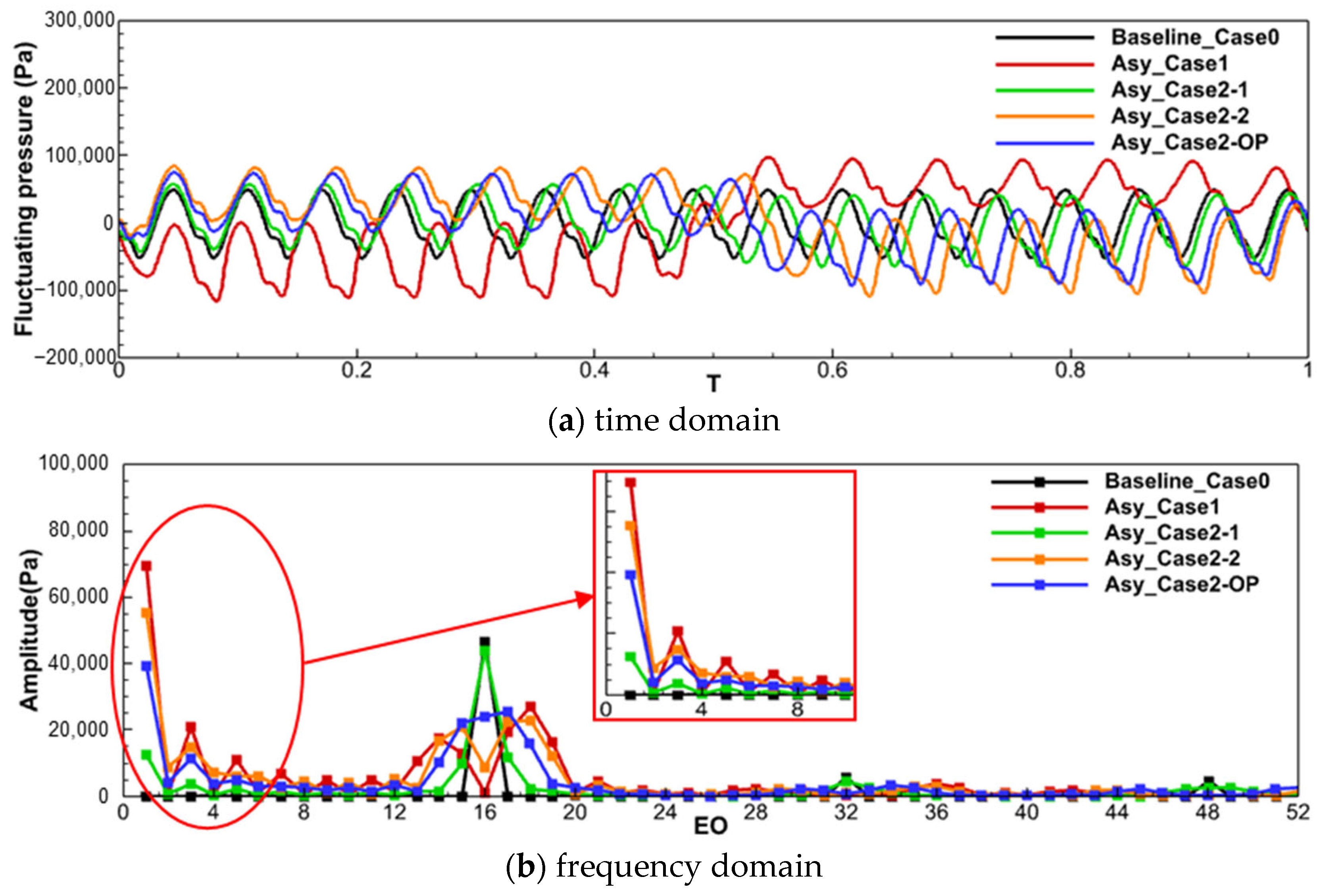 Figure 10b. The highest amplitude among the HEO aerodynamic excitations is only 54.86% of the VPF amplitude in Baseline_Case0, indicating that Asy_Case2-OP effectively suppresses HEO aerodynamic excitation compared to Asy_Case2-1.