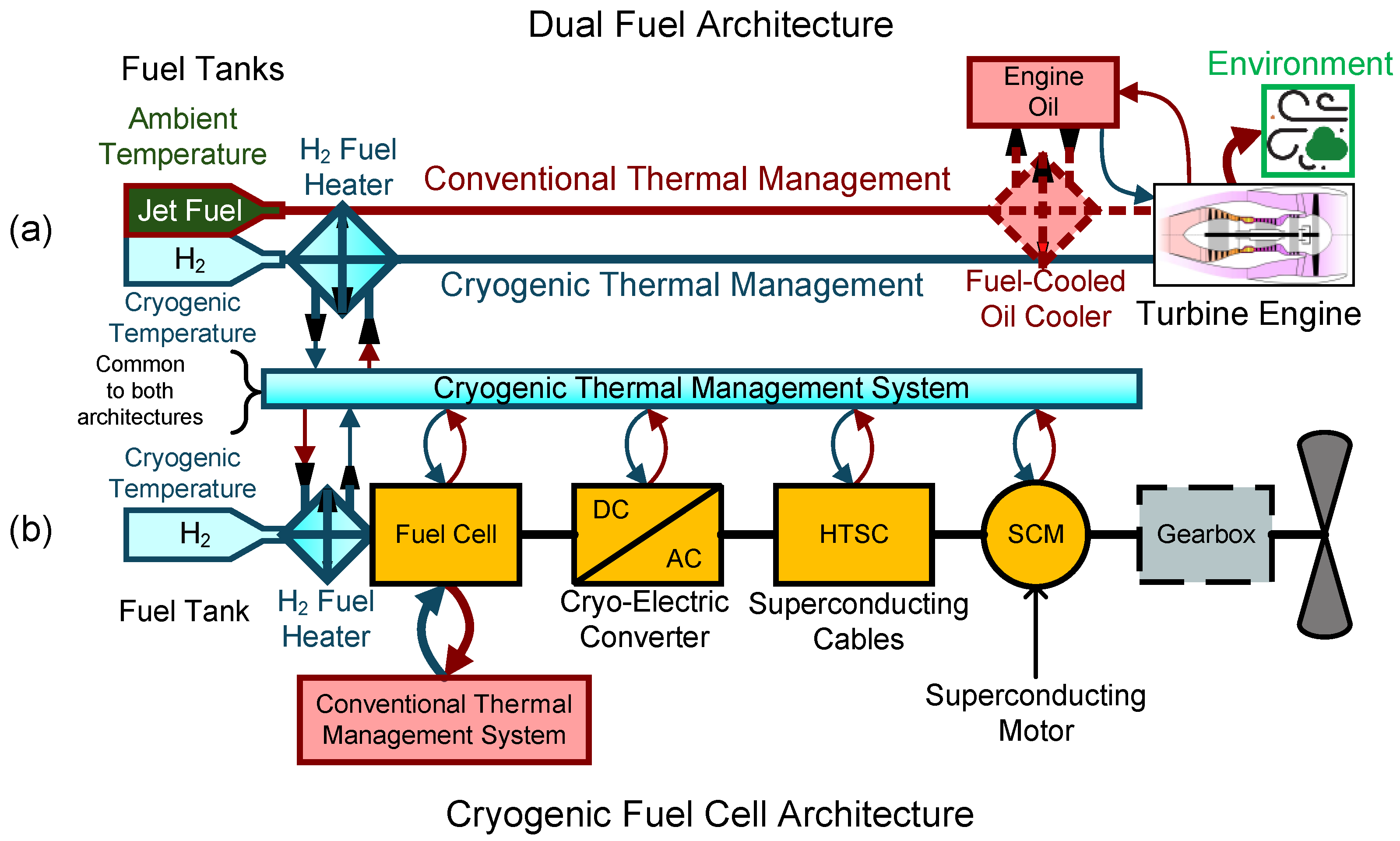 All of these architectures pose new thermal management challenges for aircraft design. The hydrogen must be stored at cryogenic temperatures as liquid hydrogen (LH2) to maximize the volumetric efficiency of the tank. Fuel cells require gaseous H2 and reject significant heat. Finally, power electronics and high-power electric machines require active cooling.
