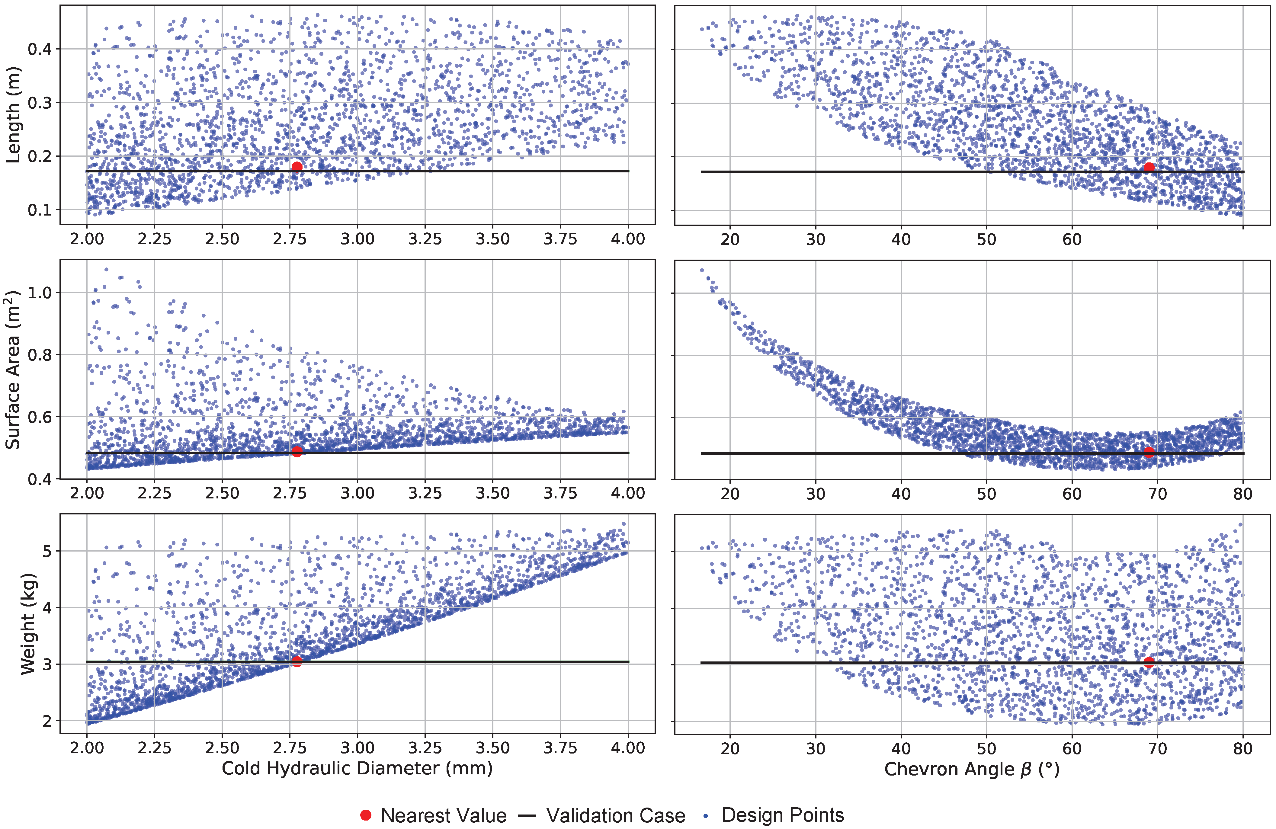 Figure 23 presents the Pareto-optimal solutions, highlighted by blue dots circled in red, as the blue dots alone represent the feasible solutions. The final design point selection employs a pseudo-weight vector approach from [