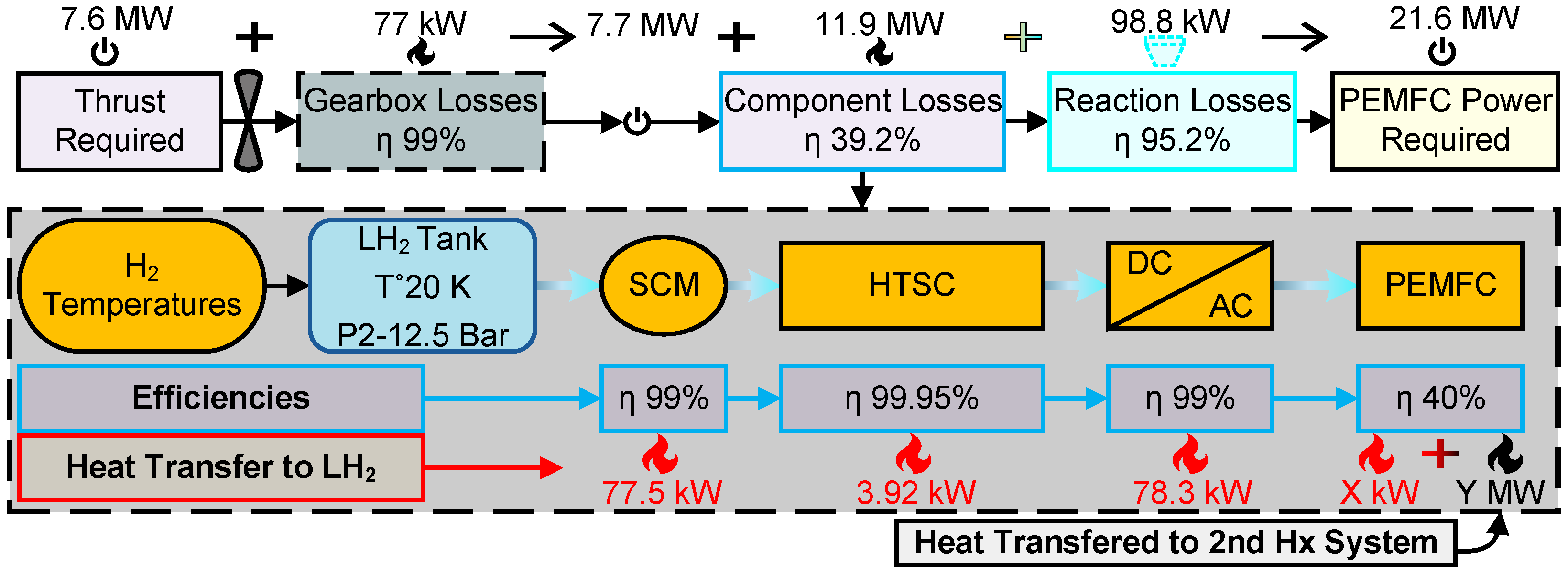 2 temperature to the FC inlet condition of 358 K, while excess thermal energy transfers to a conventional ram air HX along with the gearbox heat losses.