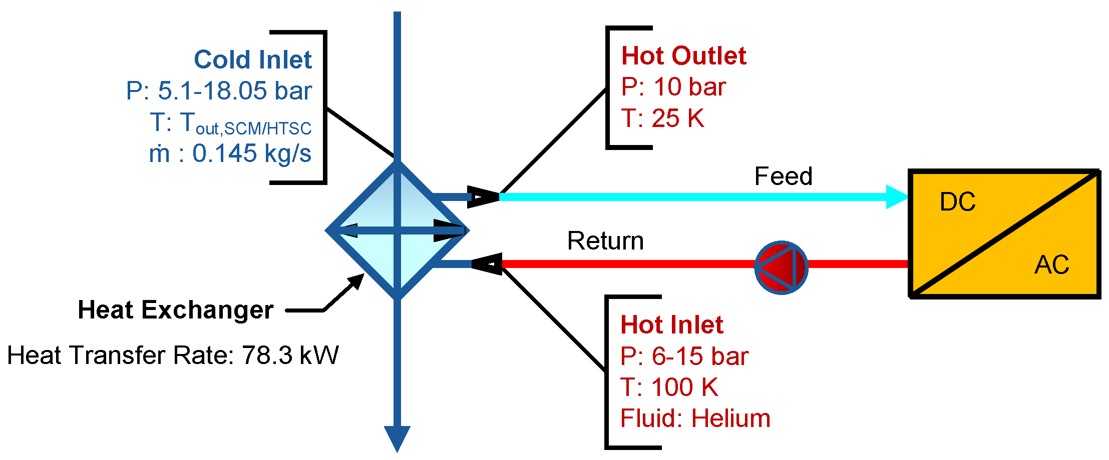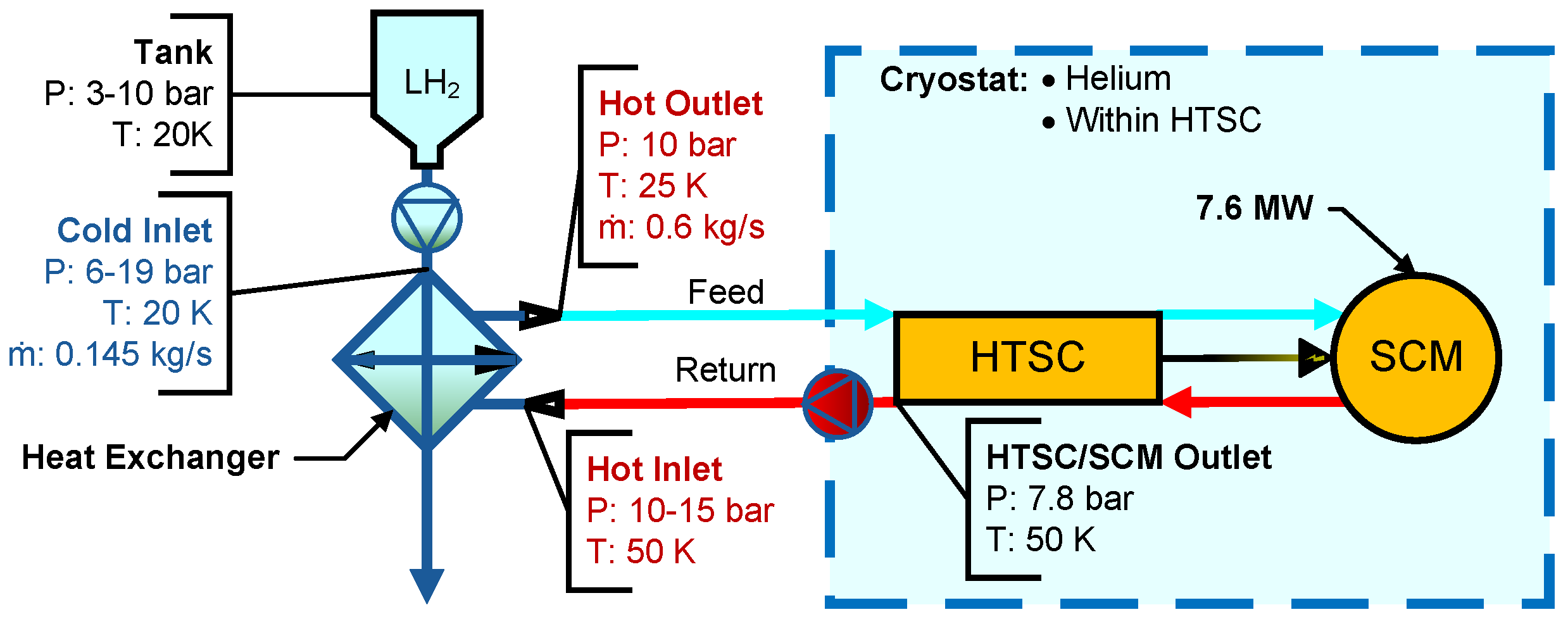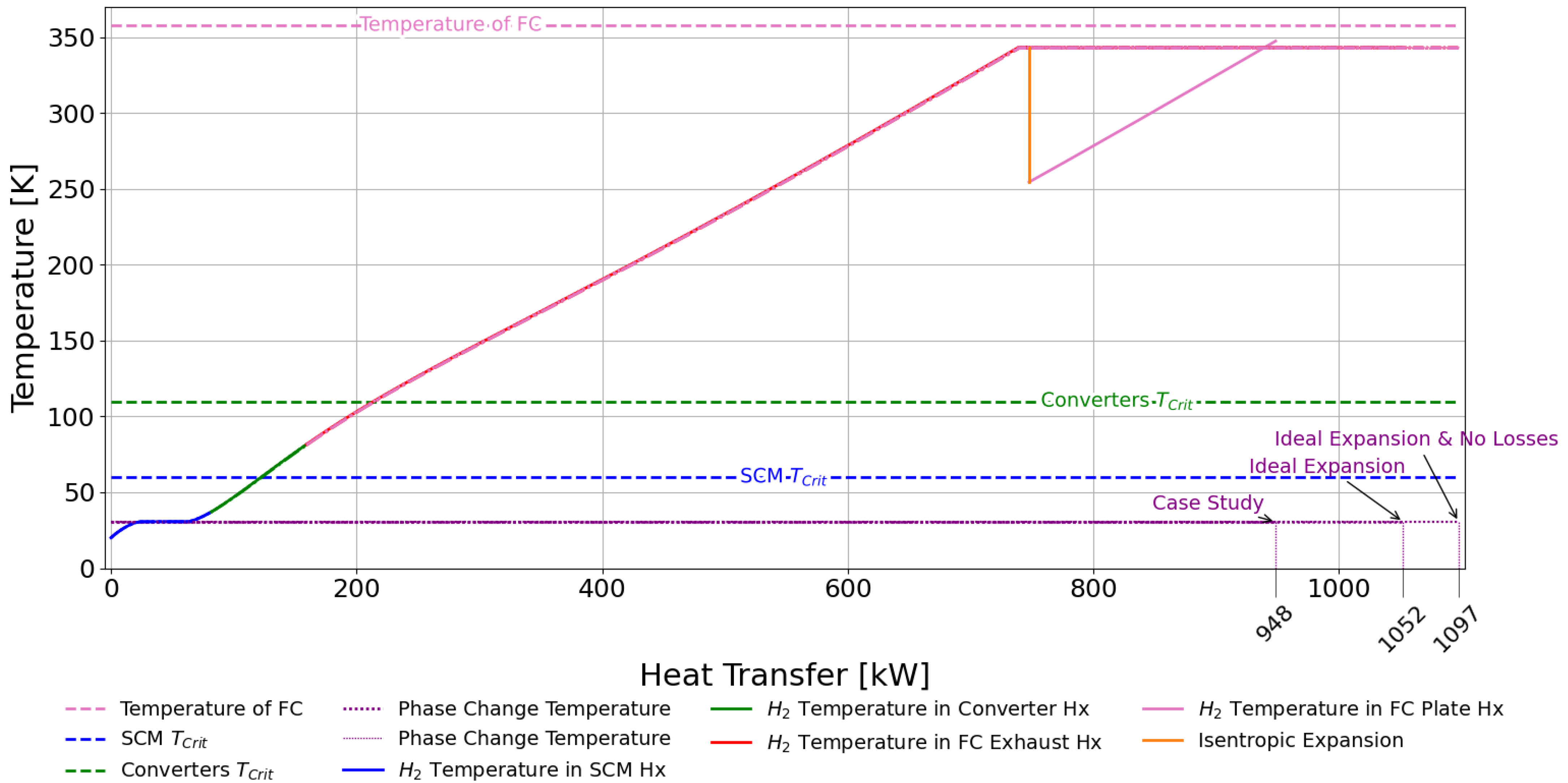 Figure 19 presents the interfacing components and corresponding sizing specifications. The hot side operates on a dependent cryogenic loop, with specifications provided by the electric motor design team from the Electric Propulsion Aircraft Project. The hot-side working fluid, mass flow rate, outlet conditions, and inlet temperature are fixed parameters, while the inlet pressure is a design variable. The cold-side operating conditions are governed by the initial storage conditions for fluid temperature, with an ideal pump facilitating the required pressure increase. The H