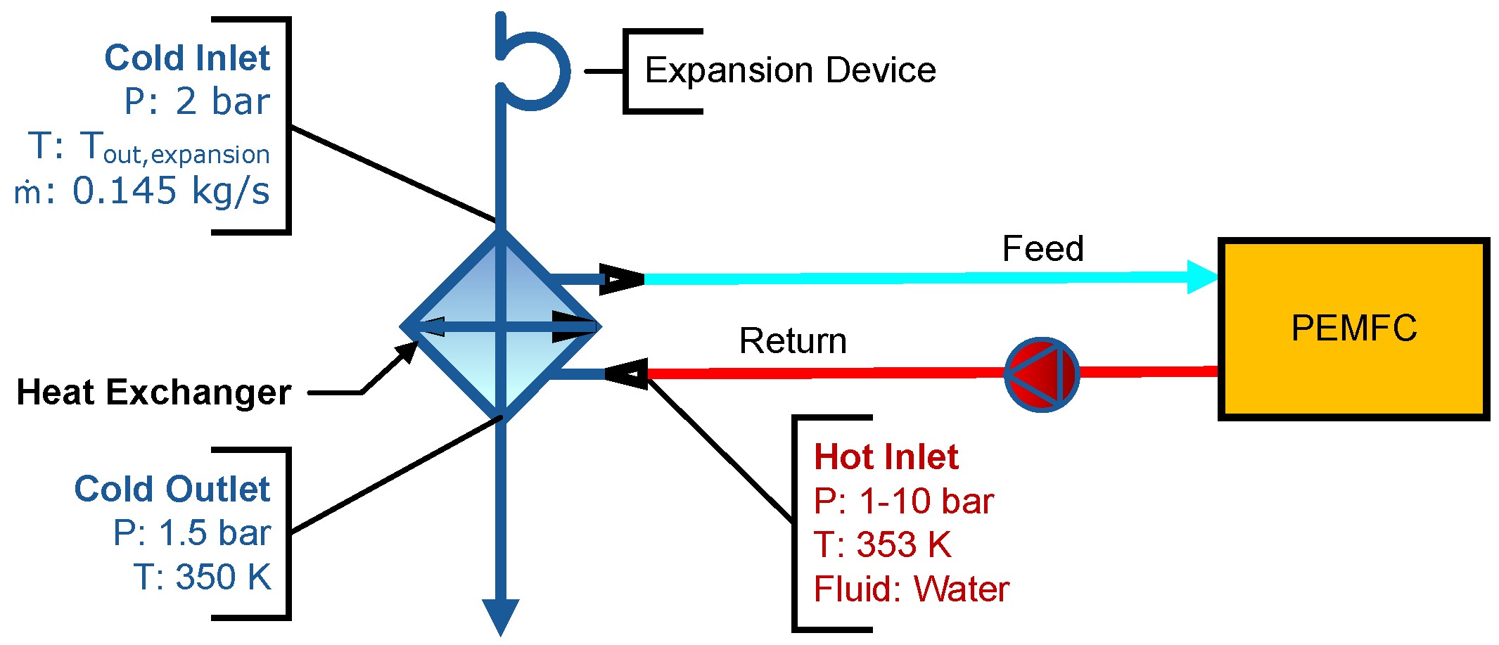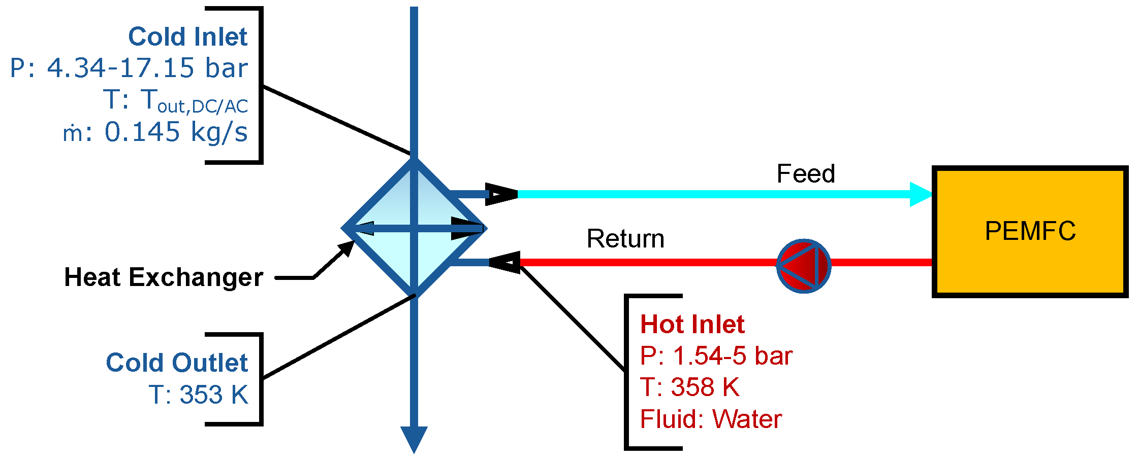 2 heating requirements to achieve PEMFC inlet specifications. The HX employs the FC coolant stream, in this case water, as the hot-side working fluid to demonstrate the methodology’s constraints. Hot-side inlet properties are governed by FC operating parameters. The cold-side thermal analysis adheres to previous HX methodologies while incorporating an additional outlet-temperature constraint.
