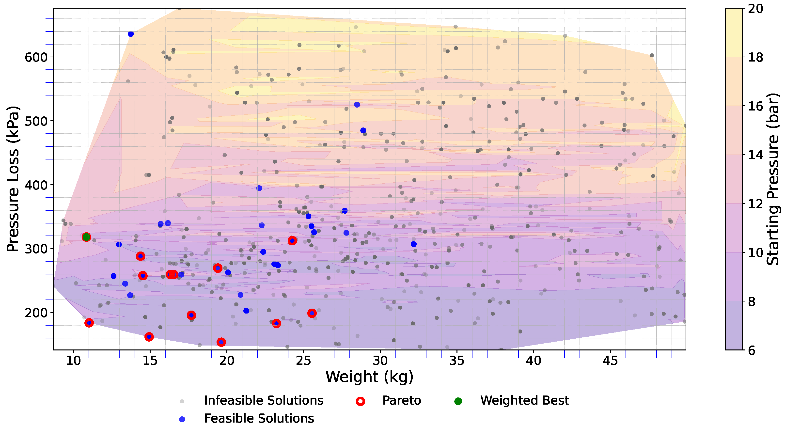 34], prioritizing the minimization of system weight, followed by starting pressure, and finally system pressure losses. The selected point is located in the bottom left quadrant and represented by a green dot over a red Pareto-optimal point. In this case, the solution has a total weight of 6.6 kg, a total pressure loss of 338.9 kPa, and a starting pressure of 13.7 bar. It is also important to note that the results shown have been truncated to the area of interest by weight (≤50 kg), with all values outside the region not displayed.