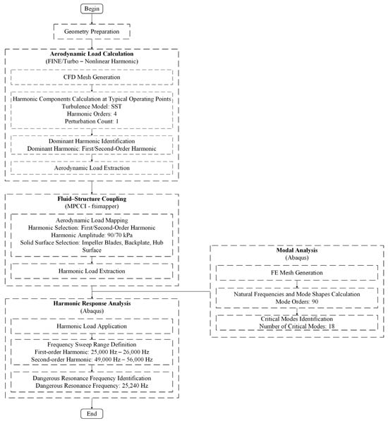 Figure 7 shows the FSI harmonic response analysis process. The workflow includes four parts, i.e., aerodynamic load calculation, one-way FSI, modal analysis, and harmonic response analysis. In the vibration analysis of radial flow turbines, the impeller exhibits high stiffness and damping due to the integrally bladed disk structure. Both experimental and numerical studies generally indicate that this characteristic results in small blade vibration amplitudes under most operating conditions, and the associated influence on the flow field can be neglected. Under these circumstances, the one-way FSI method can predict the vibration response with adequate accuracy, with only limited differences compared with the two-way FSI method. On this basis, the one-way FSI method is applied to predict the vibration response of the turbine [17]. The airflow excitations are computed using the NLH method. The resulting unsteady aerodynamic loads are subsequently mapped onto the finite element model through the fsimapper module of MPCCI. Based on these mapped loads, modal and harmonic response analyses are performed in Abaqus to determine the natural frequencies, mode shapes, vibration responses, and corresponding stress levels under airflow excitation, thereby enabling the assessment of potential resonance risks.
