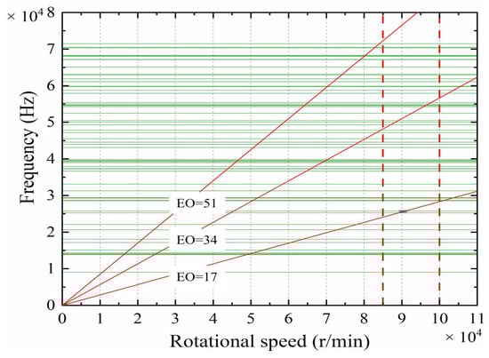 The impeller is made of 2A12 aluminum alloy; Table 3 lists the material properties of the 2A12 aluminum alloy, which is used in the modal analysis and harmonic response analysis. Modal analysis is performed to compute the first 90 natural modes. Figure 12 shows the Campbell diagram of the turbine impeller, where multiple intersections between the first- and second-order excitation lines and the natural frequency branches can be observed. The green lines represent the natural frequencies of the impeller, and the red dotted lines indicate the typical operating speed range of the turbine. Within the scope of this study, the turbine operates in a normal rotational speed range of 85,000–100,000 rpm. Taking the impeller rotational frequency as the fundamental frequency, the high-speed relative motion between the impeller and the nozzles results in multiple airflow excitation components. For the staggered nozzle configuration with 17 nozzles per row, the first-order airflow excitation occurs at 17 times the fundamental frequency (excitation order, EO = 17), while the second-order excitation appears at 34 times the fundamental frequency (EO = 34). In addition, higher-order excitations (EO ≥ 51) are also induced on the impeller.