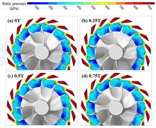 Figure 16 presents the instantaneous static pressure distributions at the CUT1 section for the double-row staggered nozzle layout at 90,000 rpm. When the impeller rotates circumferentially relative to the nozzles, the static pressure in the regions away from the rotor–stator interaction interface, e.g., the nozzle inlet, has no significant variation. However, near the rotor–stator interface, such as at the beveled portion of the nozzle exit and the leading-edge region of the impeller inlet, the static pressure distribution exhibits substantial changes. For example, when the impeller’s leading edge sweeps past the trailing edge of one nozzle and moves towards the trailing edge of the adjacent nozzle, it causes the low-pressure zones near the exits of the two nozzles to gradually shift circumferentially. This results in a corresponding periodic increase and decrease in static pressure at the leading edge of the impeller inlet. On the CUT1 section, the region with the largest static pressure variation within the impeller is located on the suction side of the leading edge, followed by the pressure side of the leading edge. Similar phenomena are observed for both the long and short blades of the turbine impeller. Figure 17 shows the instantaneous static pressure distributions at the CUT2 section. Similarly to the CUT1 section, static pressure variations occur near the rotor–stator interface, especially in the nozzle exit region and the leading edges of the impeller blades. For the impeller blades, the amplitude of static pressure variation is largest on the suction side of the leading edge and smaller on the pressure side. As the flow develops downstream within the impeller passage, the amplitude of static pressure variation gradually attenuates. Compared with the CUT1 section, the flow inside the nozzles at the CUT2 section is generally similar. However, the low-pressure region near the suction-side leading edge of the rotor at CUT2 is wider. Since the pressure in the low-pressure region is less affected by the nozzles, this indicates that the potential pressure fluctuations at the CUT2 section are smaller.