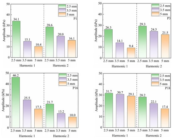 In both the tip region (P3) and the root region (P1), the amplitudes of the first three excitation orders are relatively high. The highest amplitude in the tip region is the second-order excitation, reaching 29.3 kPa, while the most prominent in the root region is the first-order excitation, with an amplitude of 34.1 kPa. In the mid-span region (P2), the amplitudes of the first- and third-order harmonics are markedly reduced. The second-order excitation is found to be dominant. This suggests that, in the mid-to-high-span region near the blade leading edge, the second-order excitation dominates over the first-order excitation.