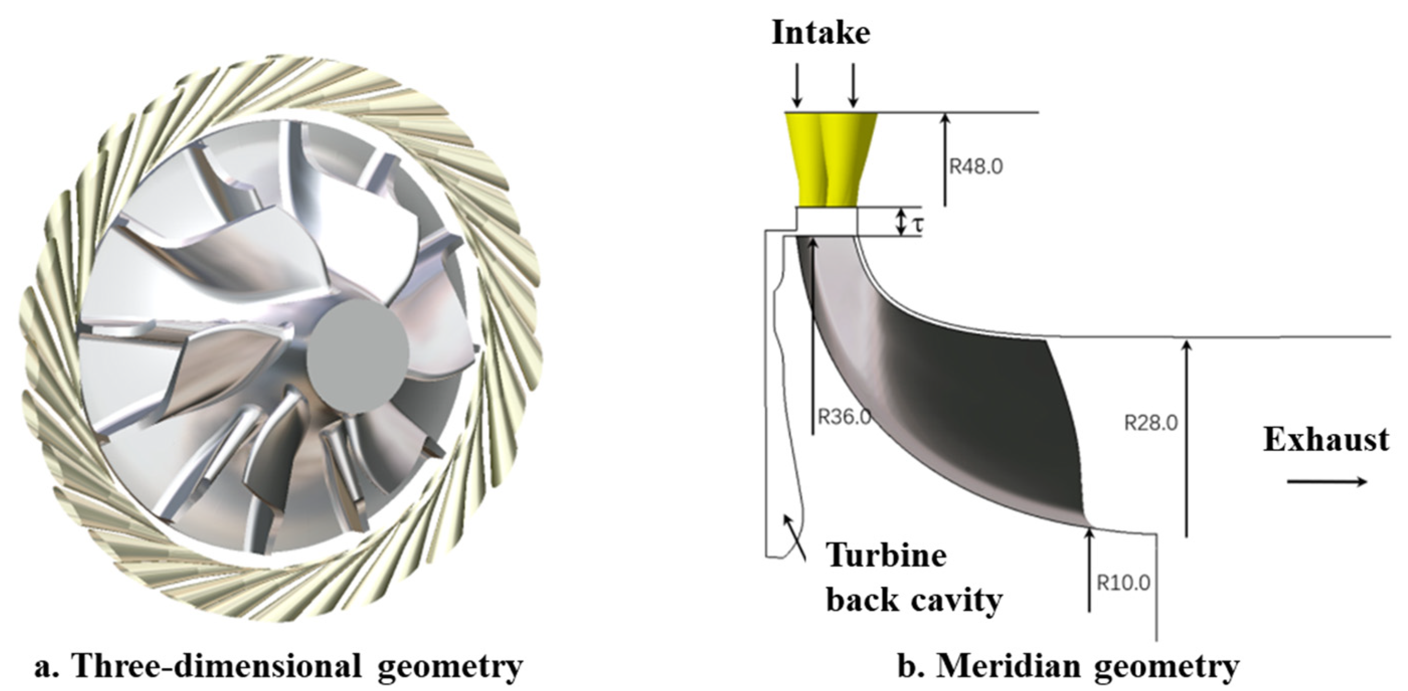 - Yu, X.; Li, Y.; Liu, Z.; Yin, B.; Wang, L. Study on the Influence of Volute Throat Jet on Excitation Vibration Alleviation of Radial Turbine Blade. J. Turbomach. 2025, 147, 11010. [Google Scholar] [CrossRef]